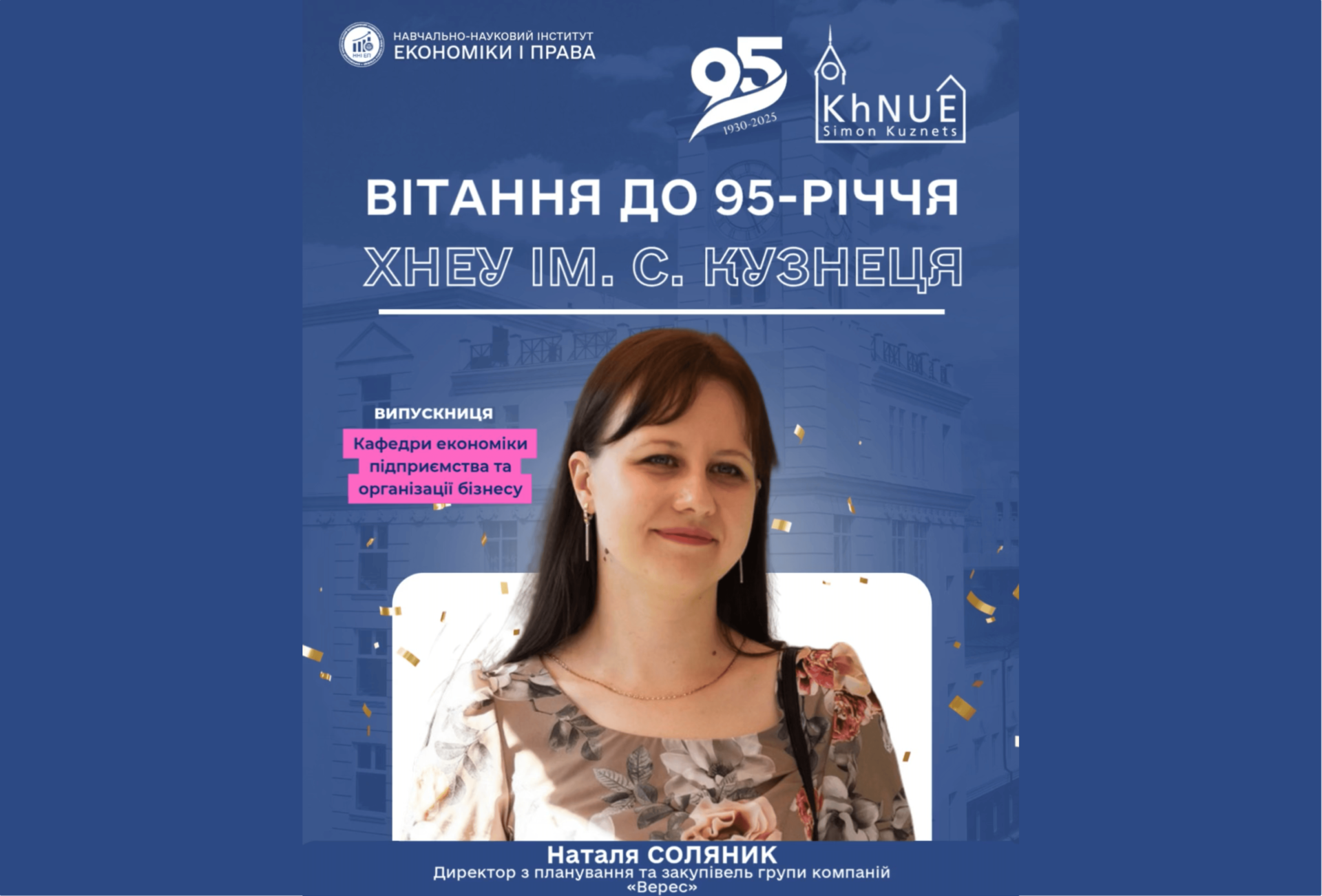 🎉 Вітальний марафон до 9️⃣5️⃣-річчя ХНЕУ ім. С. Кузнеця триває!Сьогодні з нами Наталя Соляник — випускниця кафедри економіки підприємства та організації бізнесу, директор з планування та закупівель групи компаній «Верес». Дякуємо за теплі слова й натхнення для наших студентів та випускників! 💙Пишаємось успіхами нашої спільноти та продовжуємо...